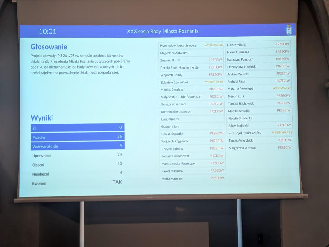 20.01.2026 r. na XXX sesji Rady Miasta Poznania radni odrzucili naszą obywatelską inicjatywę uchwałodawczą dotyczącą wprowadzenia wyższego podatku od pustostanów deweloperskich. Zebraliśmy ponad 700 podpisów mieszkańców Poznania. Żaden radny nie zagłosował za. 26 było przeciw, 4 się wstrzymało.
